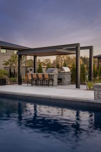 Cette continuité donne l’impression que la maison, la cour arrière et la piscine font partie d’un même ensemble, plutôt que d’espaces séparés. L’entrée de la piscine devient une extension naturelle de l’espace de vie.