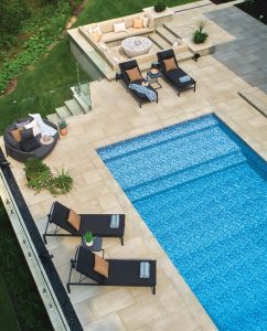 L’utilisation de la dalle Méga Melville en pas japonais crée un accès clair de la maison à la terrasse de la piscine. Alignées avec soin, les dalles guident les déplacements et invitent à se diriger vers la piscine et la zone de détente autour du foyer. Cette disposition accentue l’effet de longueur et renforce l’harmonie du projet.