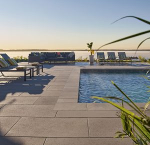 Si la dalle Méga Melville, installée de manière linéaire, unifie les grandes surfaces, la dalle Melville 60 présente un contraste visuel subtil qui permet d’identifier clairement les sentiers. Dans ce projet, cette dernière, installée selon un motif modulaire à 45 degrés, apporte du mouvement au tracé et permet de distinguer les zones de circulation. Cette différence de motif de pose permet de relier les espaces extérieurs de façon fluide, tout en restant en harmonie avec la résidence et les zones végétales.
